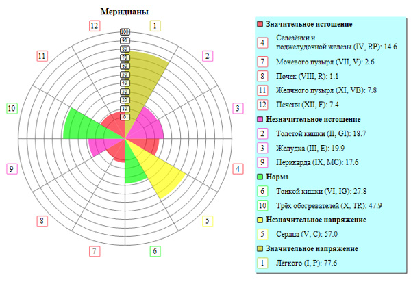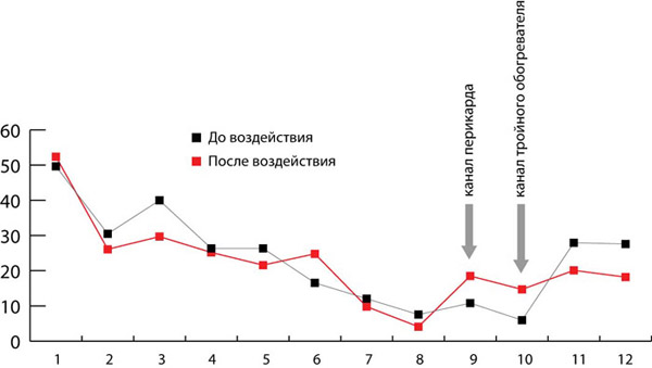 По оси абсцисс – 12 главных терапевтических меридианов в соответствии с порядковым номером в международной классификации.