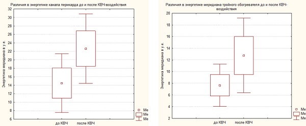 После КВЧ-воздействия произошло увеличение энергетики в каналах перикарда и тройного обогревателя. При этом достоверные изменения были зафиксированы только в канале перикарда, а в канале тройного обогревателя наблюдалась только статистическая тенденция.