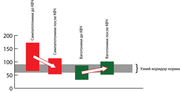 Кроме этой тенденции по перераспределении энергии в каналах, была обнаружена еще одна важная закономерность. Участников исследования разделили на две группы в зависимости от конституциональной предрасположенности к симпатотонии или ваготонии. Затем было выявлено, что после КВЧ-воздействия у симпатотоников уменьшился индекс напряжения (IN), а у вагатоников он увеличился.