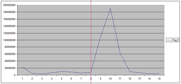 Это график общей мощности спектра. Затмение приходится на 8 день. Затем следует двухдневный спад. В принципе, это соотносится с давно известным фактом, что после новолуния происходит «энергетическое затишье».